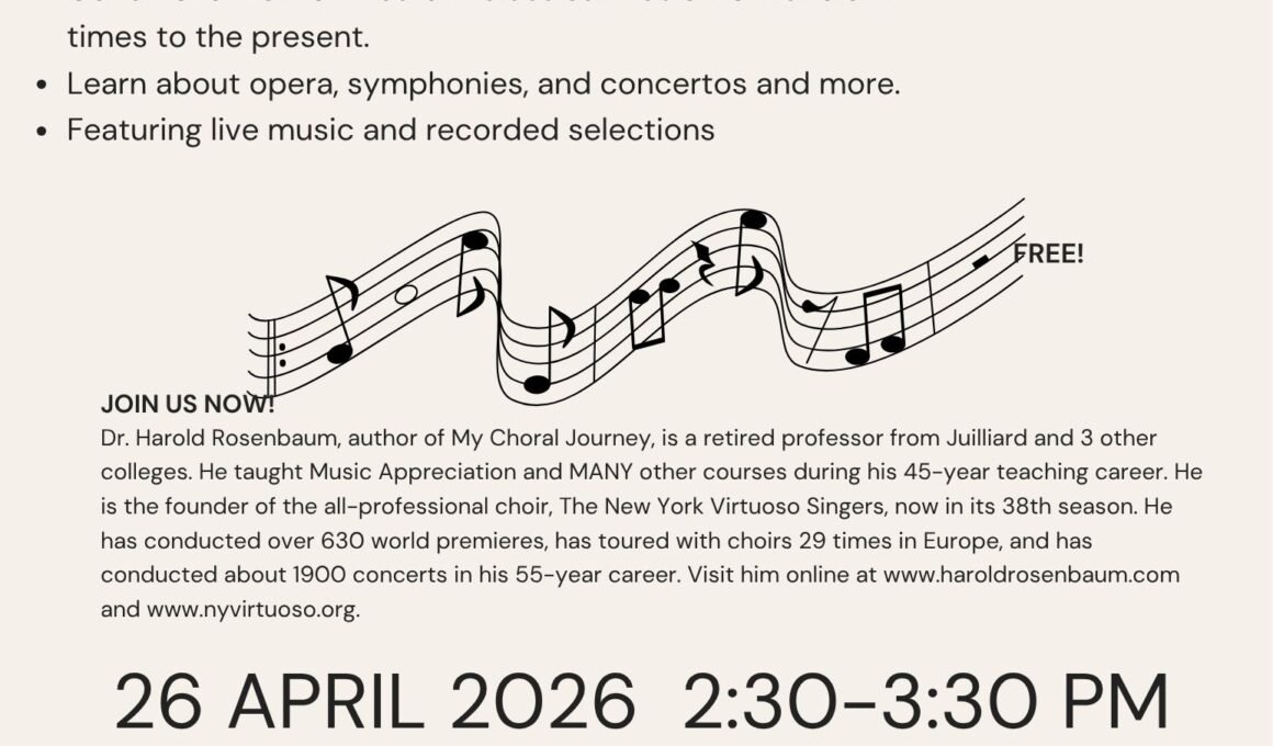 Dr. Harold Rosenbaum, author of My Choral Journey, is a retired professor from Juilliard and three other colleges. He taught Music Appreciation and many other courses during his 45-year teaching career. He is the founder of the all-professional choir, The New York Virtuoso Singers, now in its 37th season. He has conducted 600 world premieres, has toured with choirs 29 times in Europe, and has conducted about 1900 concerts in his 55-year career. Visit him online.