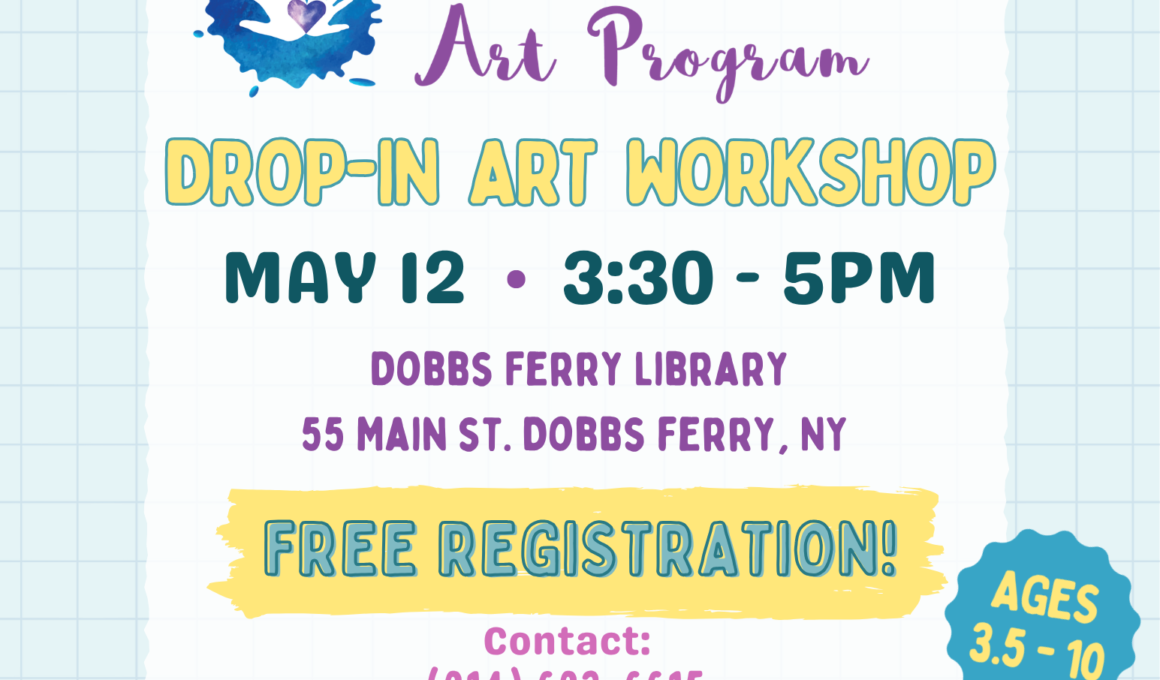 Art Explorations with Creative Hearts Art Program (Registration) Tuesday, May 12 3:30 pm - 5:00 pm Ages 3.5 – 10 Drop-in art workshop with Creative Hearts Registration required – email childrens@dobbsferrylibrary.org or call (914) 693-6615