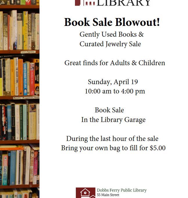 Book Sale Blowout! Sunday, April 19 10:00 am - 4:00 pm The Friends of the Library present our annual Book Sale Blowout! Gently Used Books Curated Jewelry Sale Great finds for Adults & Children During the last hour of the sale, bring your own bag to fill for $5.00!