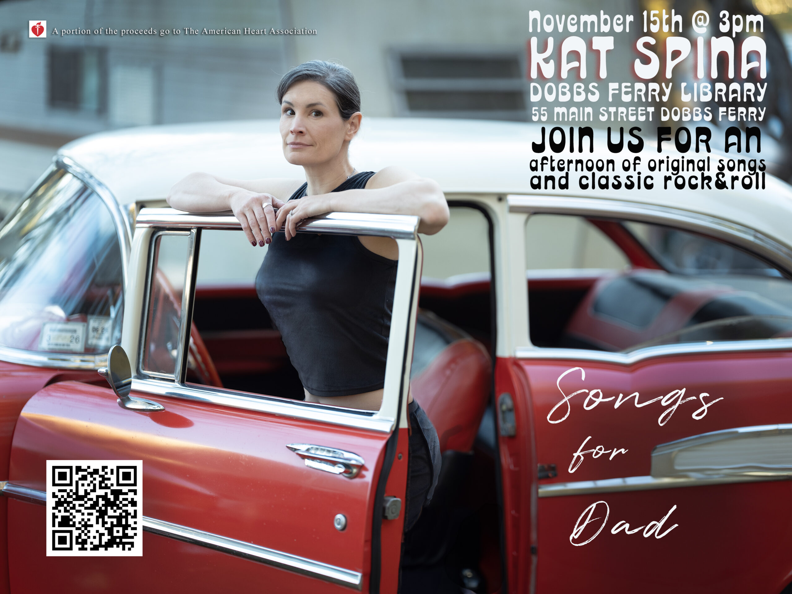 Join us for an afternoon of music with singer songwriter Kat Spina! Kat and her band will be performing original songs celebrating her dad Lenny who passed last year, as well as performing rock covers he loved. A portion of the proceeds for the show will go to the American Heart Association.