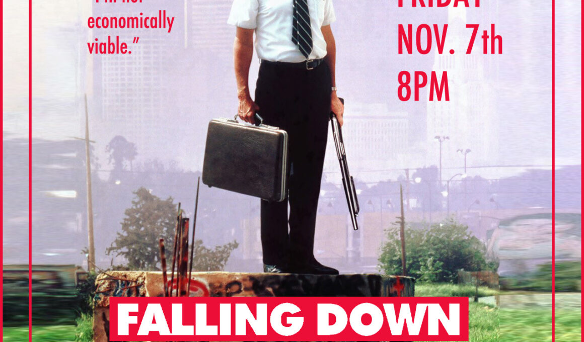 Join us for another “Fan Selection Friday” on November 7th at 8pm, as we screen Falling Down (1993/Rated R/112 min/Psychological Drama, Crime, Thriller), selected by Mairéad!