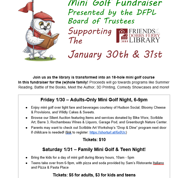 Join us as the library is transformed into an 18-hole mini golf course in this fundraiser for the (w)hole family!
