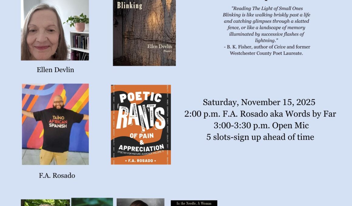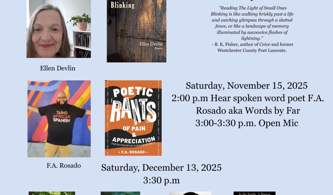 Join local authors in the lounge overlooking the Hudson as they read from their new books. Book sale and signing will follow!