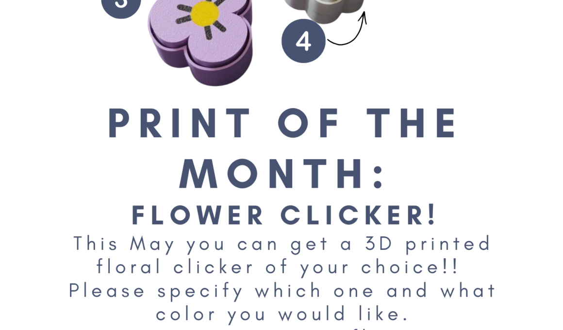This May you can get a 3D printed floral clicker of your choice! Please specify which one and what color you would like (if you don’t specify a color a staff member will choose):