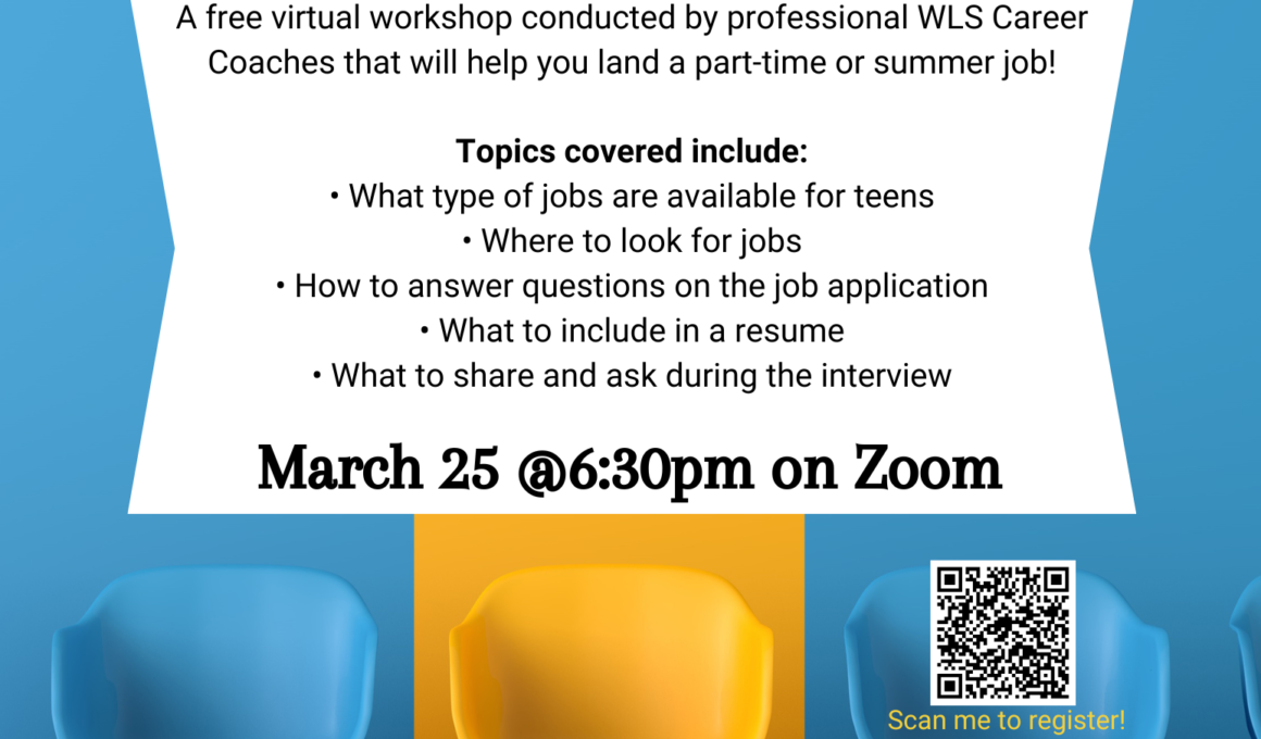 Tips, applications, resumes, and more. A free virtual workshop conducted by professional WLS Career Coaches that will help you land a part-time or summer job!